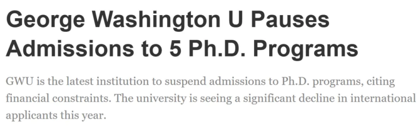 近期。美国高等教育界再传震动消息——乔治·华盛顿大学(George Washington University,GWU)宣布暂停 5 个博士项目的 2026 秋季招生,成为又一所因财政压力与国际生人数下降而不得不调整博士教育布局的知名院校。