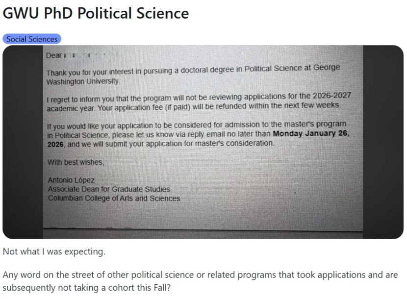 据学生在社交媒体的透露,相关项目的申请者已在上周收到学校官方邮件,通知称这些项目“将在 2026–2027 学年不再审理博士申请”。邮件中写道:已缴纳的申请费将予以退还,同时也向申请者提供了转而考虑硕士项目的机会。