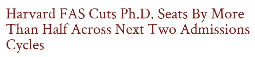 在另一边,哈佛大学(Harvard University)文理学院也进行了博士招生规模缩减。